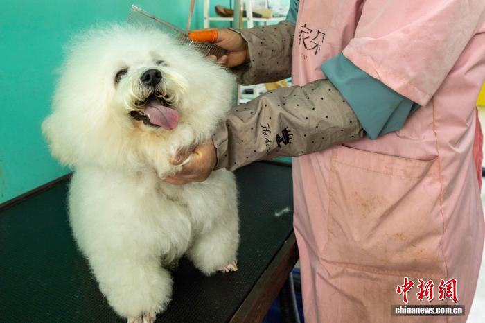 宿州一家宠物店工作人员在给小狗梳理毛发。(资料图)宿州市委宣传部 供图