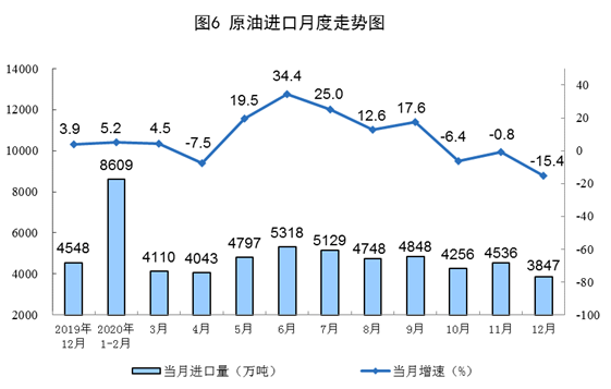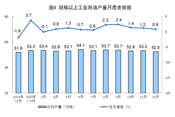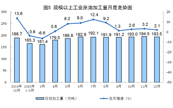 原油生產增速略有放緩。12月份,生產原油1627萬噸,同比增長0.9%,增速比上月回落0.3個百分點;日產52.5萬噸,環(huán)比減少0.7萬噸。加工原油6000萬噸,同比增長2.1%,比上月回落1.1個百分點。2020年,生產原油1.95億噸,比上年增長1.6%;加工原油6.7億噸,增長3.0%。