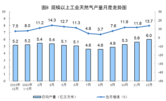 12月份,規(guī)模以上工業(yè)原煤、天然氣、電力生產加快,原油生產略有放緩。2020年,規(guī)模以上工業(yè)原煤產量略有增加,原油生產增速加快,天然氣保持快速增長,電力生產穩(wěn)定增長。