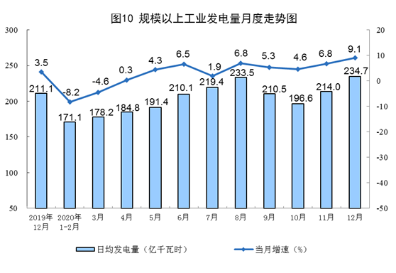 電力生產增速繼續(xù)加快。12月份,發(fā)電量7277億千瓦時,同比增長9.1%,增速比上月加快2.3個百分點;日均發(fā)電234.7億千瓦時,環(huán)比增加20.7億千瓦時。2020年,發(fā)電量74170億千瓦時,比上年增長2.7%。