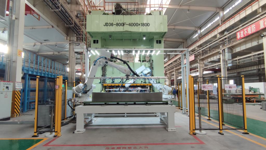 2026年1月,兰石集团大型热交换装备先进级智能工厂内,机械臂正在进行板片压制作业。(受访者供图)