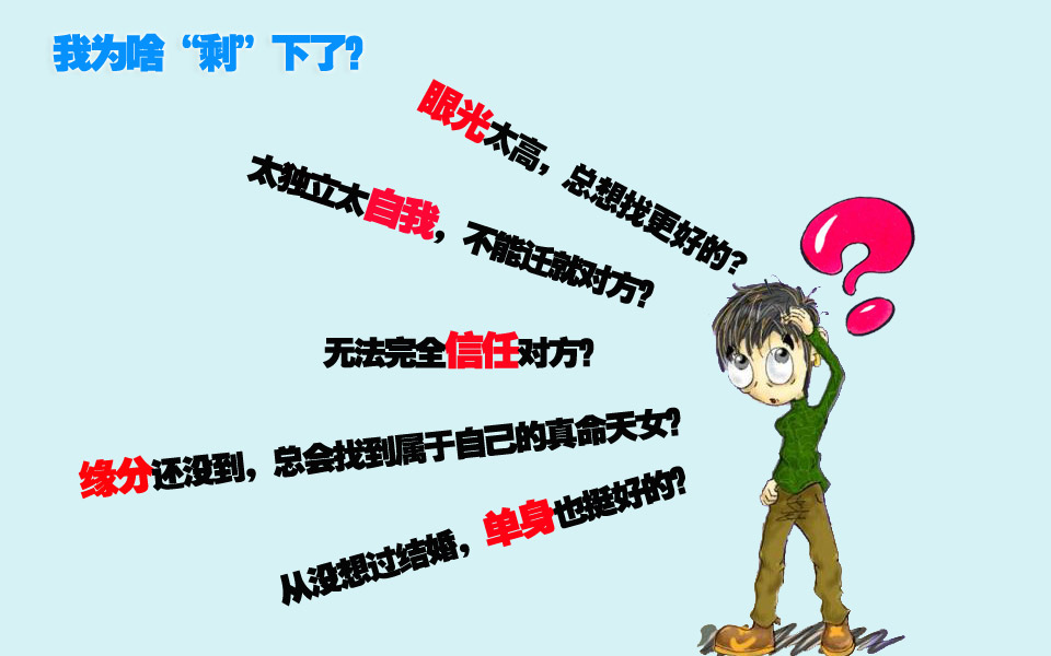 @沙礫:其實,這年頭,沒有無緣無故的剩男,出來混,總是有因有果的,別光抬頭看天,有時也要低頭看看路,更要平時看看周圍的人。 別總占著一枝花,心里想著整個花園,到頭來啥也沒剩,把自己剩下了!