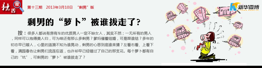 @稻草人:你嫁,或者不嫁人;你媽總在那里,忽悲忽喜;你剩,或者不剩下,青春總在那里,不來只去;你挑,或者不挑剔;貨就那么幾個,不增只減;你認(rèn),或者不認(rèn)命;愛情總得忘記,不舍也棄;來剩男的懷里,或者,讓剩男住進你心里。