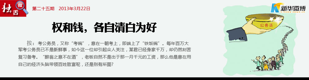 如果千萬富翁考上公務(wù)員 千萬富翁考公務(wù)員折射的是某些政府部門“門難進(jìn)、事難辦”的現(xiàn)狀,也反映出當(dāng)下企業(yè)的生存無奈。假設(shè)他有朝中舉,好的結(jié)果是政府吸納了一名懂經(jīng)濟(jì)的得力干將,壞的結(jié)果則是又多出一個(gè)亦官亦商的“紅頂商人”。