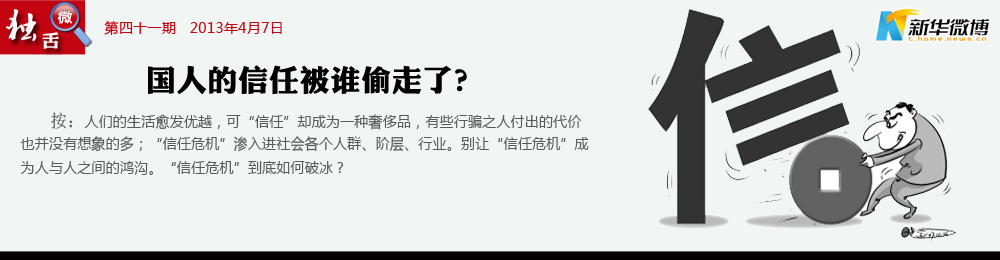 當(dāng)“造假”成為“理所當(dāng)然” 誰偷走了中國人的信任?一個(gè)段子說是在如今中國,賣包子的不吃自己做的包子,種菜不吃自己種的菜,賣藥的不敢吃自己生產(chǎn)的藥,賣奶粉則從不吃國產(chǎn)的奶粉。當(dāng)造假作假、坑蒙拐騙成一種風(fēng)氣,甚至成一種理所當(dāng)然時(shí)尚,每個(gè)人能做的就只剩兩件事了:一個(gè)是只信自己,另一個(gè)是絕不信別人。