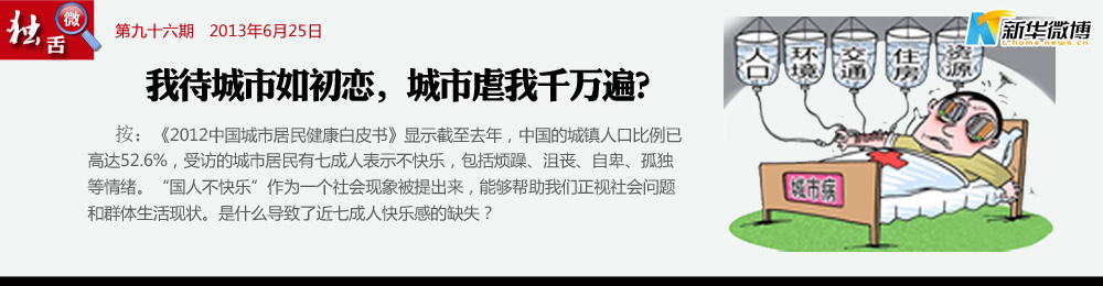 城市病了 光污染、空氣污染、噪音污染、熱島效應(yīng)、食品安全、交通障礙、高空拋物、樓宇消防電梯……吸的是霧霾,吃的是不放心食品,高起的物價(jià),昂貴的醫(yī)療,上學(xué)難,就業(yè)難,國(guó)人能健康嗎?能快樂(lè)嗎?