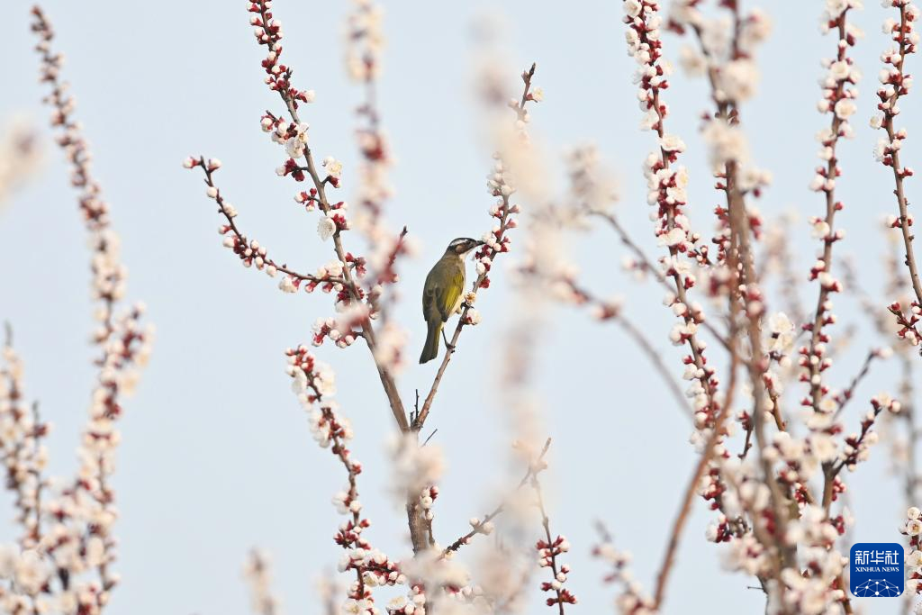 3月12日,在山东省滕州市西岗镇一公园,小鸟在花间嬉戏觅食。
