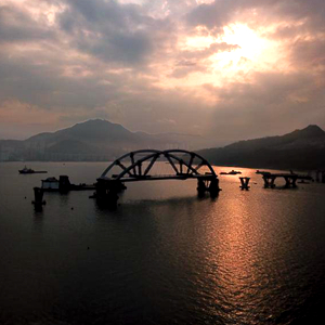2月25日傍晚,將軍澳海灣斜陽夕照,波光粼粼。遠(yuǎn)遠(yuǎn)看去,一艘巨大的駁船“馱”著一座雙拱鋼橋靜靜地停泊在海面中間。