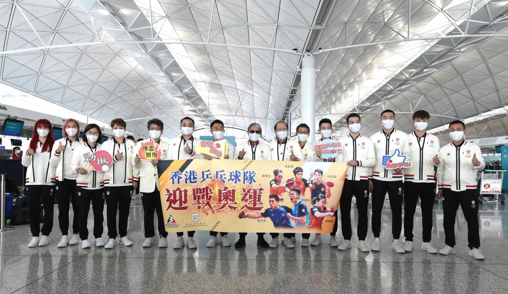 7月17日,中國香港體育協(xié)會暨奧林匹克委員會會長霍震霆(中)、中國香港代表團(tuán)團(tuán)長貝鈞奇(右七)與中國香港乒乓球隊(duì)教練及運(yùn)動員合影。當(dāng)日,中國香港代表團(tuán)從香港國際機(jī)場出發(fā)參加?xùn)|京奧運(yùn)會。據(jù)悉,中國香港代表團(tuán)將有46名運(yùn)動員參加?xùn)|京奧運(yùn)會38個小項(xiàng)的爭奪。新華社記者盧炳輝攝