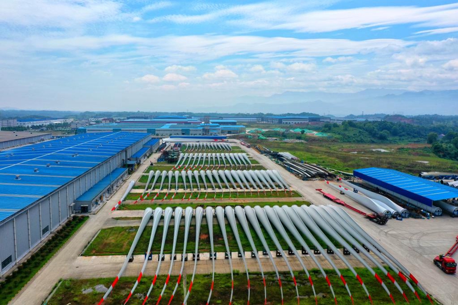 大型風(fēng)電葉片生產(chǎn)企業(yè)中材科技(萍鄉(xiāng))風(fēng)電葉片有限公司航拍景象。(王強(qiáng)攝 新華社通聯(lián)照片)