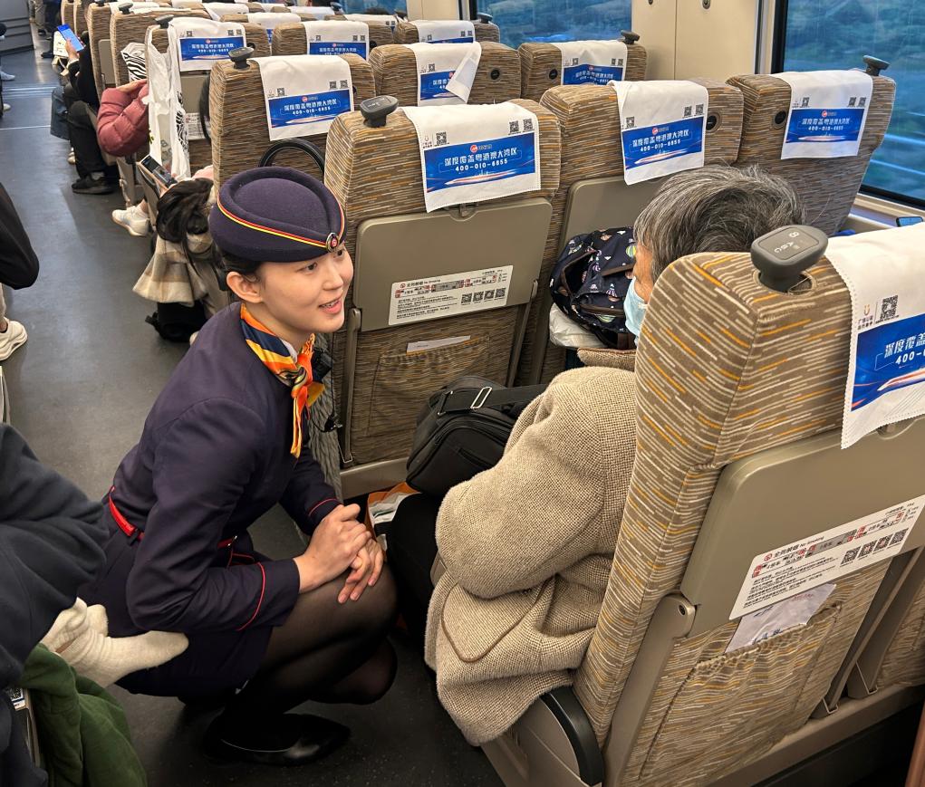 2月7日,G5131次列车列车长任丹丹在车厢内问候老人。新华社发(李格格 摄)