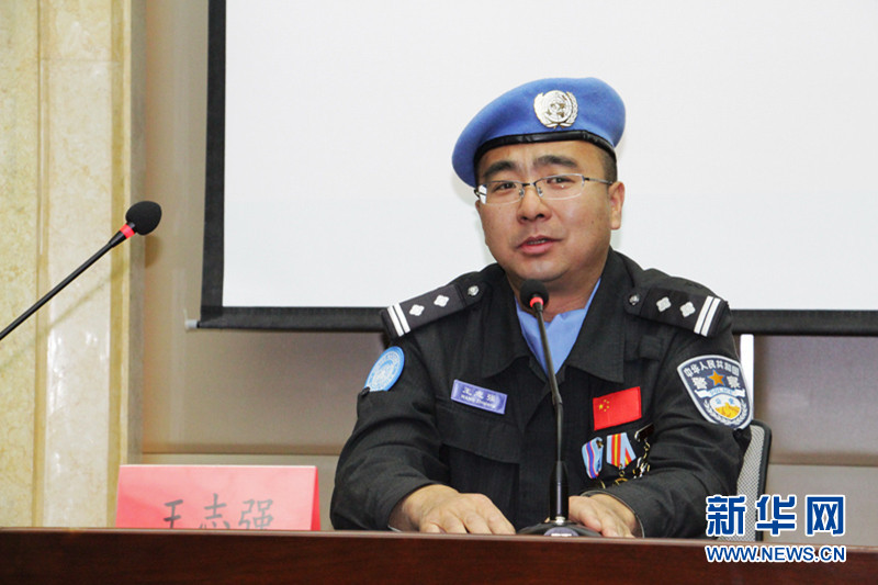 第二支赴利比里亞維和警察防暴隊副隊長王志強向?qū)W員們講述維和中的見聞感受