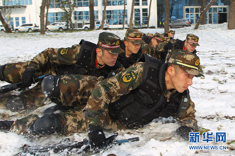 防暴隊(duì)隊(duì)員在雪地上開展戰(zhàn)術(shù)訓(xùn)練