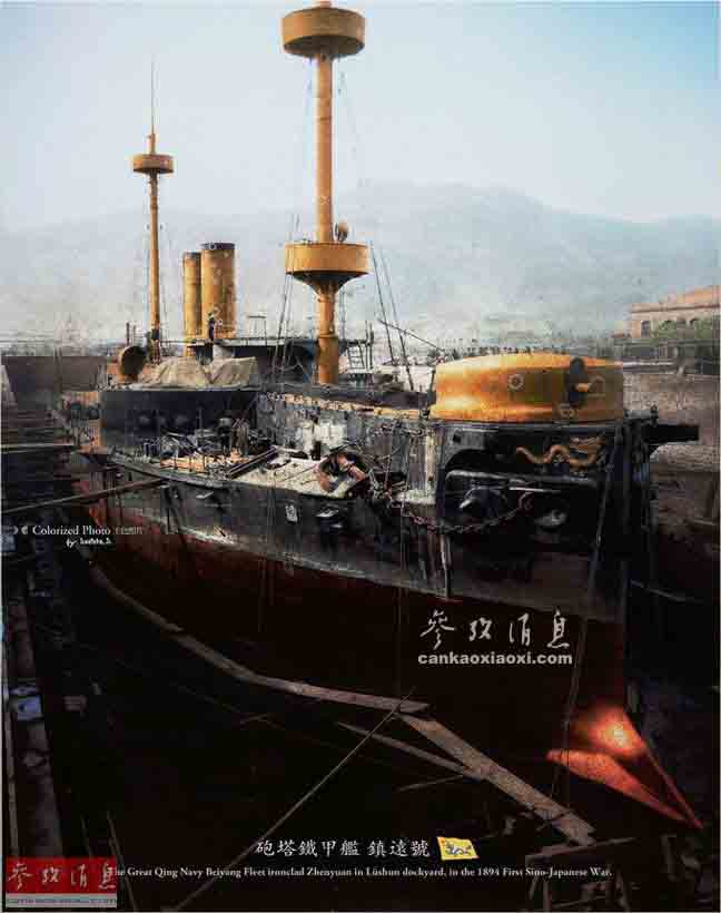 1894年,中日甲午海戰(zhàn)前夕,停泊在旅順船廠船塢進(jìn)行維護(hù)的大清帝國海軍“鎮(zhèn)遠(yuǎn)”號戰(zhàn)列艦。