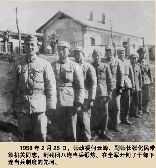 ????1958年8月,毛澤東主席在北戴河召開的中央政治局?jǐn)U大會議上講話指出:“我們的軍官,像云南的一個(gè)師長,一年當(dāng)一個(gè)月兵,我看這是好辦法?!@樣,我們的軍隊(duì)就是永遠(yuǎn)打不散的軍隊(duì)?!泵飨谥械膸熼L,實(shí)際是當(dāng)時(shí)的師政委何云峰,而下連當(dāng)兵的地方便在該團(tuán)三營八連,八連也被譽(yù)為下連當(dāng)兵第一連。