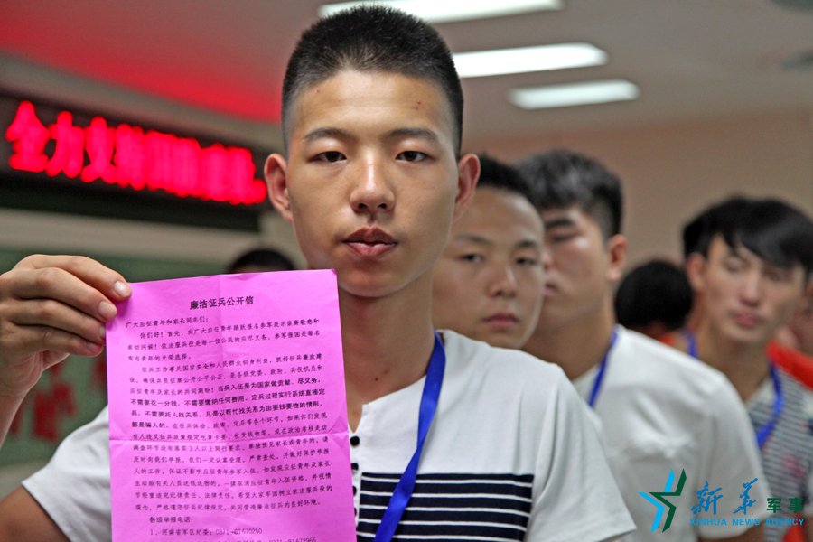 ????新華網(wǎng)鄭州8月11日電(雒根生)“當(dāng)兵入伍是為國(guó)家做貢獻(xiàn)盡義務(wù),不需要繳納任何費(fèi)用。凡是以幫忙找關(guān)系為由要錢要物的情形,都是騙人的!”河南省武陟縣喬廟鄉(xiāng)18周歲的預(yù)征對(duì)象王云祥10日收到了武陟縣征兵辦印制的《廉潔征兵公開信》。為確保不發(fā)生一起違反征兵政策現(xiàn)象,武陟縣征兵辦公室專門印制1000份廉潔征兵公開信發(fā)放給每一位參檢對(duì)象及家長(zhǎng),并公布了省市縣三級(jí)監(jiān)督舉報(bào)電話。