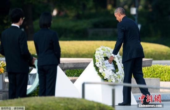 ????資料圖:2016年5月27日,美國總統(tǒng)奧巴馬乘直升機抵達日本廣島和平紀念公園附近,展開對和平紀念公園的訪問并獻上花環(huán)。