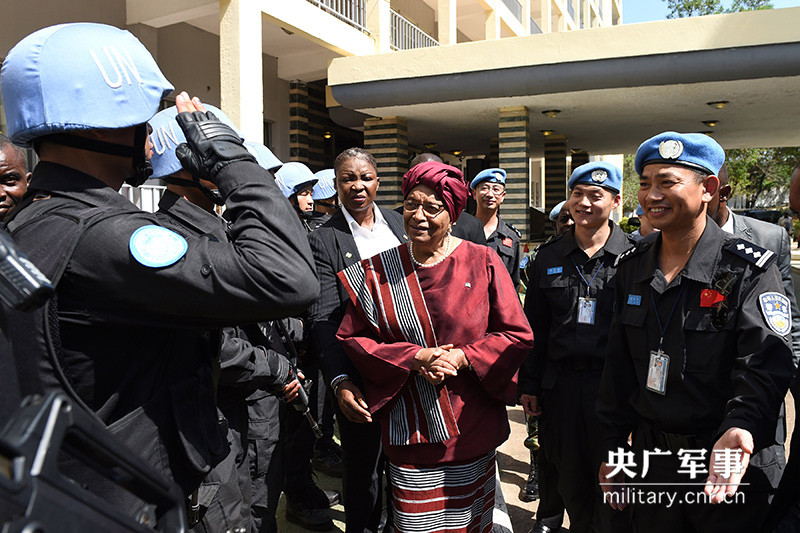 圖為利比里亞總統(tǒng)瑟利夫看望慰問防暴隊隊員。(資料圖)