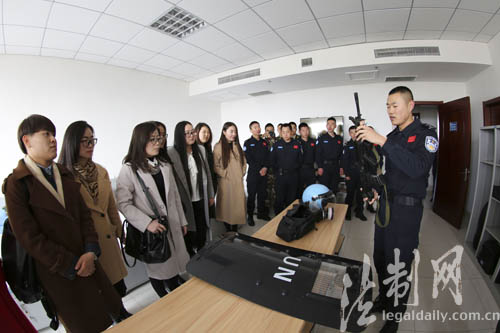 ????上午9時,一輛掛著“相約藍盔、愛在警營”紅色橫幅的大巴車緩緩駛入警隊營區(qū)。一下車,姑娘們饒有興致地參觀了警隊內務設置和裝備展示,現(xiàn)場觀看了藍盔方陣扣人心弦的戰(zhàn)術表演,隊員們氣吞萬里的練兵激情、敢打必勝的過硬素質,一下子吸引了大家的眼光。在此之前,她們只是在心中默默仰慕那頂“藍色貝雷帽”,從電視上看到過威武帥氣的維和隊員。第一次如此近距離接觸,讓不少姑娘的心中蕩起層層漣漪。
