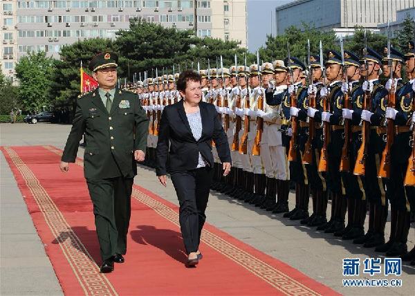 5月16日,國務委員兼國防部長常萬全在北京與波斯尼亞和黑塞哥維那國防部長瑪麗娜·彭黛什舉行會談。會談前,常萬全為彭黛什舉行歡迎儀式并陪同檢閱中國人民解放軍三軍儀仗隊。新華社記者 劉芳 攝