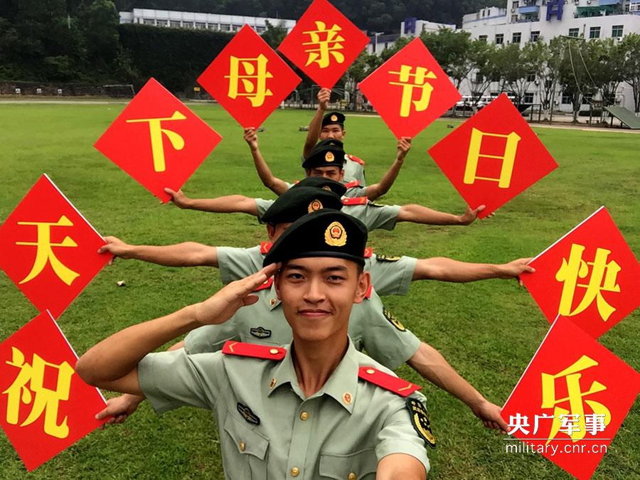 5月13日,武警廣東省邊防總隊(duì)機(jī)動支隊(duì)官兵手舉祝福語,一起為母親送上節(jié)日問候。