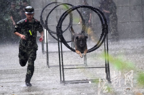 ????連日來(lái),深圳市暴雨頻繁,深圳市氣象臺(tái)于6月20日9時(shí)10分在全市發(fā)布暴雨黃色預(yù)警,全市進(jìn)入暴雨戒備狀態(tài)。而在深圳市梅林山邊防警犬基地,卻是一片熱火朝天大練兵景象。駐守在這里的廣東邊防總隊(duì)機(jī)動(dòng)支隊(duì)警犬分隊(duì)訓(xùn)導(dǎo)員和警犬將磅礴大雨當(dāng)成練兵好時(shí)機(jī),開(kāi)展穿越障礙系列訓(xùn)練,錘煉惡劣環(huán)境下人犬協(xié)同遂行多樣化任務(wù)硬功,砥礪血性膽氣!