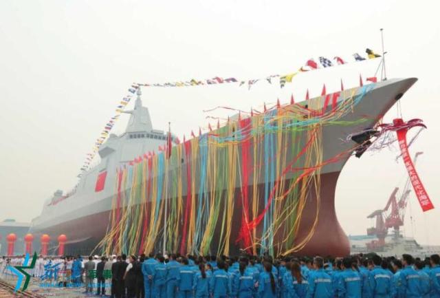 ?。箷r許,儀式開始,隨著儀式現(xiàn)場全體人員齊聲高唱的國歌聲,鮮艷的五星紅旗冉冉升起。剪彩后進(jìn)行了“擲瓶禮”,一瓶香檳酒在艦艏摔碎,絢麗的彩帶從兩舷噴射而出,新型驅(qū)逐艦鳴響汽笛,全場響起熱烈掌聲。隨后,驅(qū)逐艦在拖曳牽引下緩緩移上浮箱后下水。