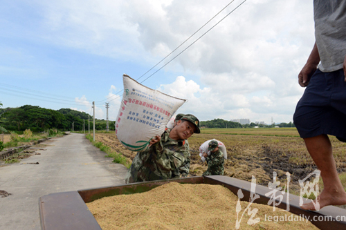 廣東中山邊防官兵走進(jìn)田間地頭幫農(nóng)戶搶收稻谷