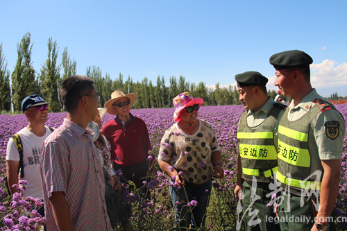????每年6月、7月,數(shù)萬(wàn)畝薰衣草爭(zhēng)相怒放,匯成一片紫色的海洋,吸引大量游客前去觀(guān)賞。新疆公安邊防總隊(duì)伊犁邊防支隊(duì)梁三宮邊防派出所官兵因地制宜打造“紫郁之鄉(xiāng)110”這一特色警務(wù),在治安防控、服務(wù)群眾、素質(zhì)提升等方面走出了一條新路子,用使命、責(zé)任與情感為游客保駕護(hù)航,讓游客享受一趟“滿(mǎn)意之旅”。