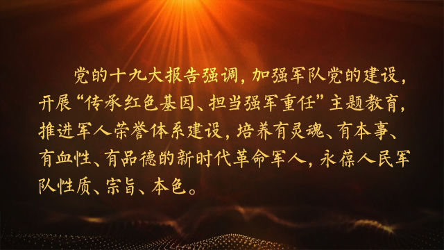 黨的十九大報(bào)告強(qiáng)調(diào),加強(qiáng)軍隊(duì)黨的建設(shè),開展“傳承紅色基因、擔(dān)當(dāng)強(qiáng)軍重任”主題教育,推進(jìn)軍人榮譽(yù)體系建設(shè),培養(yǎng)有靈魂、有本事、有血性、有品德的新時(shí)代革命軍人,永葆人民軍隊(duì)性質(zhì)、宗旨、本色。