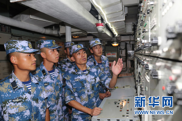 海軍沈陽艦艦空導(dǎo)彈區(qū)隊(duì)長、三級(jí)軍士長舒令(前左三)帶領(lǐng)區(qū)隊(duì)人員學(xué)習(xí)裝備知識(shí)(2017年9月3日攝)。新華社發(fā)(王游 攝)
