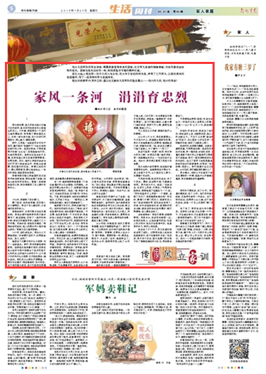 眼瞅著又快到建軍節(jié)了,昨個(gè)兒,我叫來(lái)大兒子敬朋,指著門楣上懸掛的“光榮之家”牌匾,對(duì)他說(shuō):“兒啊,把匾取下來(lái),擦干凈,8月1日那天早上咱再掛上去,要讓早上的太陽(yáng),首先照亮它。因?yàn)椤褪窃奂掖鄠鳌Ⅴr血凝成的家風(fēng)?。 保钪?口述 謝學(xué)楓/整理)