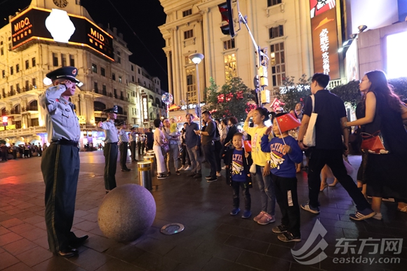 10月4日晚上20時30分,在南京東路與湖北路交叉口,武警上??傟爤?zhí)勤五支隊官兵正在疏導(dǎo)游客,突然手持國旗的3名小朋友走到執(zhí)勤官兵面前,朝著執(zhí)勤的戰(zhàn)士敬了個禮,并向執(zhí)勤的戰(zhàn)士說:“叔叔,您辛苦了。”隨后,執(zhí)勤的戰(zhàn)士也向3位小朋友回敬了一個軍禮。這溫馨的一幕,被網(wǎng)友用手機拍照記錄,發(fā)到微信朋友圈中,感動了不少人。