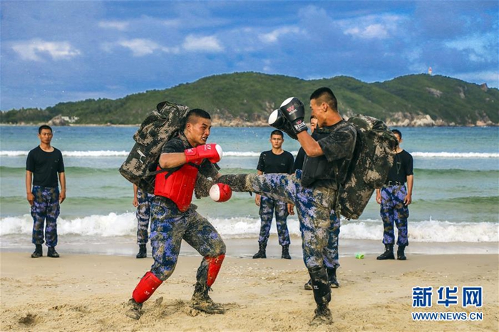 海軍陸戰(zhàn)隊某旅偵察營在三亞某海域組織特戰(zhàn)隊員進(jìn)行沙灘格斗訓(xùn)練(11月21日攝)。新華社發(fā)(范旭東 攝)