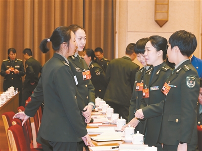 ??? 三月七日上午,出席十三屆全國人大二次會議的解放軍和武警部隊代表團舉行第一次全體會議。會議間隙,女代表們相互討論交流。解放軍報記者 馮凱旋攝