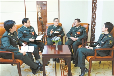 本報(bào)記者鄒維榮(左一)、柴華(右一)采訪軍隊(duì)政協(xié)委員曲新勇、王健、吳剛(左二至左四)。中國軍網(wǎng)記者 孫智英 攝