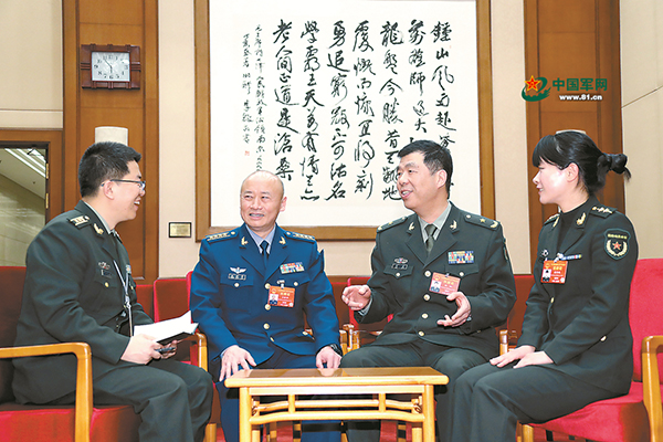 ????3月10日,解放軍報記者張軍勝(左一)采訪軍隊人大代表王獻軍、楊征、潘佳瑛(左二至左四)。解放軍報記者 穆可雙 攝