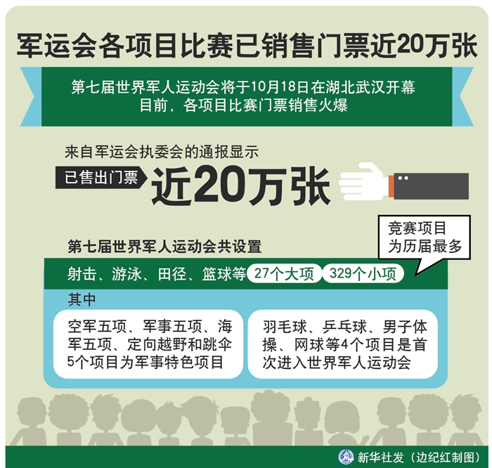 新華社武漢10月16日電(記者梁建強(qiáng))第七屆世界軍人運(yùn)動(dòng)會(huì)將于18日在湖北武漢開幕。目前,各項(xiàng)目比賽門票銷售火爆。來(lái)自軍運(yùn)會(huì)執(zhí)委會(huì)的通報(bào)顯示,已售出門票近20萬(wàn)張。
