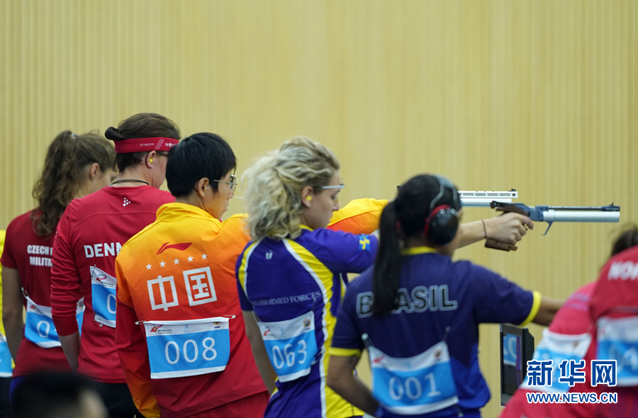 10月21日,中國隊(duì)選手王佳(左三)在比賽中。 當(dāng)日,在武漢舉行的第七屆世界軍人運(yùn)動(dòng)會(huì)空軍五項(xiàng)女子射擊比賽中,中國隊(duì)選手王佳獲得第一名。 新華社記者金良快攝