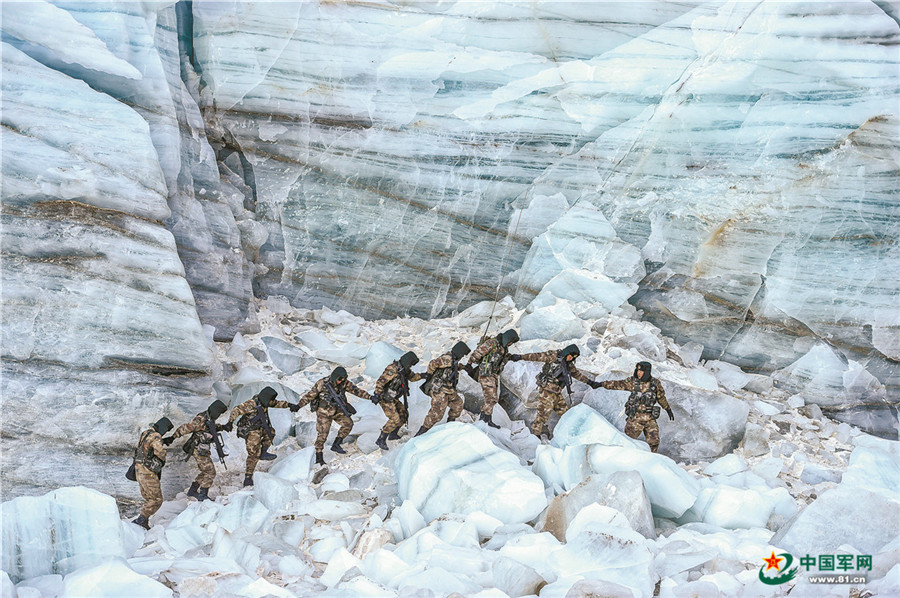 官兵手牽手通過(guò)冰川危險(xiǎn)地帶。