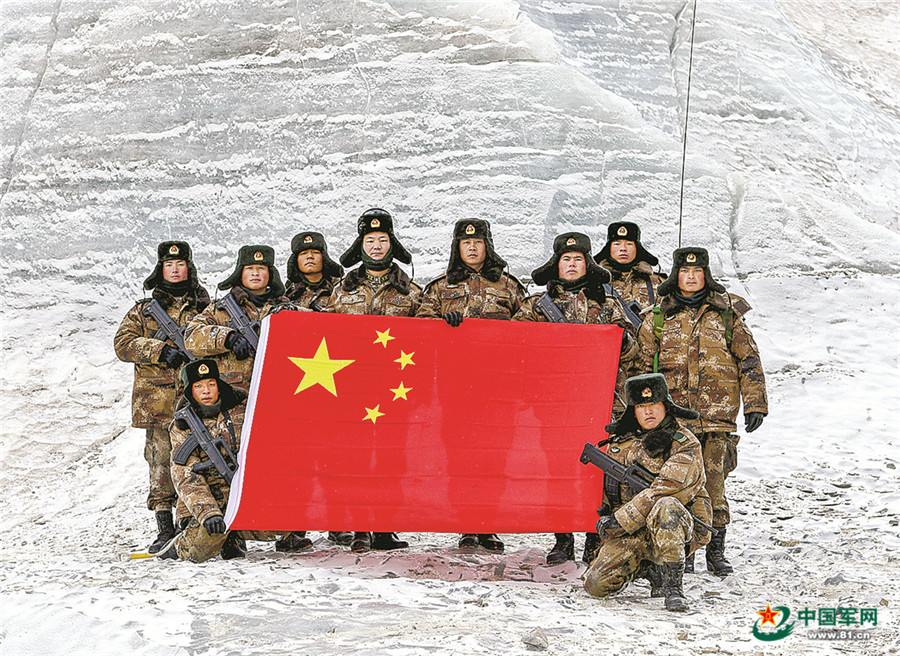 到達(dá)目的地后,官兵展開(kāi)國(guó)旗向祖國(guó)和人民送上祝福。
