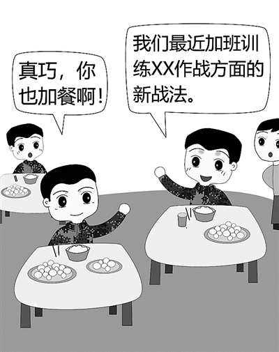 ????“真巧,你也來加餐啊?!薄笆前?,我們營最近在研訓(xùn)新戰(zhàn)法,有時會加班訓(xùn)練……我跟你說,我們研究的新戰(zhàn)法主要是××作戰(zhàn)方面,據(jù)說要在全旅推廣呢!”