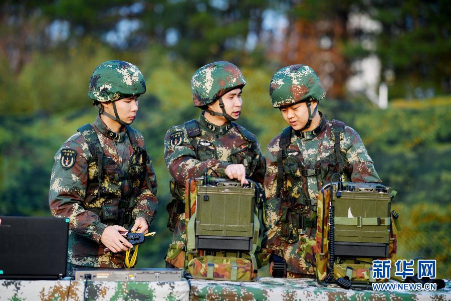 俞細文(中)利用訓(xùn)練間隙和戰(zhàn)友交流心得(12月12日攝)。新華社發(fā)(劉明松 攝)