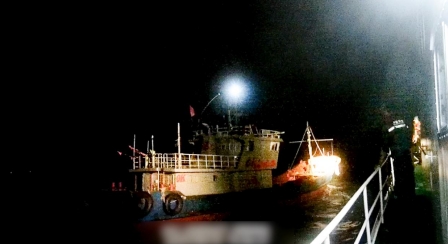 一切的源头,要追溯到2025年4月29日的深夜,浙江三门附近海域,浙江台州海警局执法艇在该海域巡逻时,发现一艘无船名船号且非法改装的渔船,正借着夜色悄然航行。更不寻常的是,船体吃水异常深,船舷几乎贴近海面,这一反常迹象瞬间引起了海警执法员的高度注意。