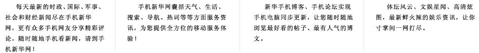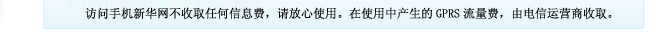 手機新華網(wǎng)是新華網(wǎng)的手機無線門戶網(wǎng)站,是中國最具權威的免費手機新聞網(wǎng)站之一。歡迎各地電信運營商以及廣告界、企業(yè)界、商務界、傳媒界等各界人士與我們聯(lián)系,精誠合作,實現(xiàn)共贏。電話:010-63070908,E-mail:xhsjb@xinhuanet.com