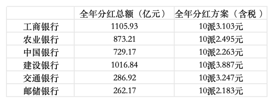 在具体分红方案上,工商银行全年分红总额位居首位,为1105.93亿元,每10股派现3.103元(含税);建设银行全年分红1016.84亿元,每10股派现3.887元(含税);农业银行全年分红873.21亿元,每10股派现2.495元(含税);中国银行、交通银行、邮储银行全年分红分别为729.17亿元、286.92亿元、262.17亿元,每10股派现分别为2.263元、3.247元、2.183元(均含税)。