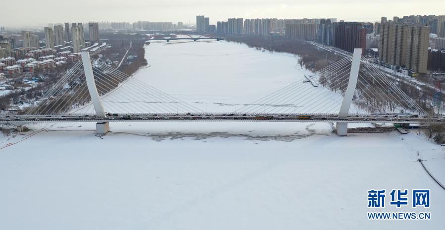 這是降雪后的沈陽市富民橋(1月28日攝,無人機照片)。