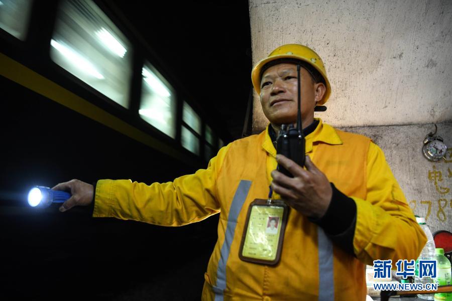 在廣西河池境內(nèi)黔桂鐵路線上的鄧山隧道,中國鐵路南寧局集團(tuán)有限公司柳州工務(wù)段的4名看守工輪換值班,依靠手電筒在黑暗中穿行,及時巡查隧道中可能出現(xiàn)的各種隱患,確保每天經(jīng)隧道運行的59趟客貨列車春運安全。鄧山隧道全長773米,是一個需要人員全天候看守的鐵路隧道。
