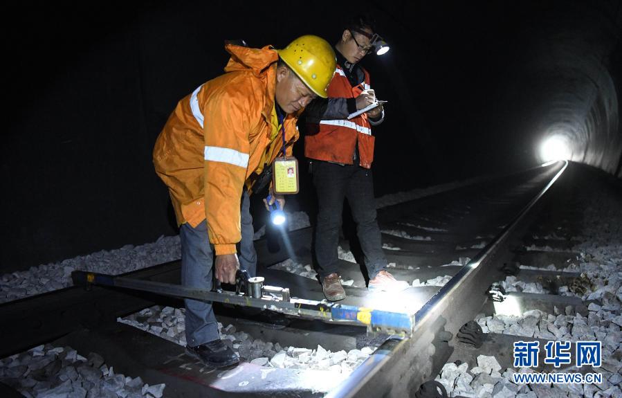 看守工廖成根(左)與工長(zhǎng)羅昌偉檢查隧道內(nèi)鋼軌幾何尺寸(1月30日攝)。