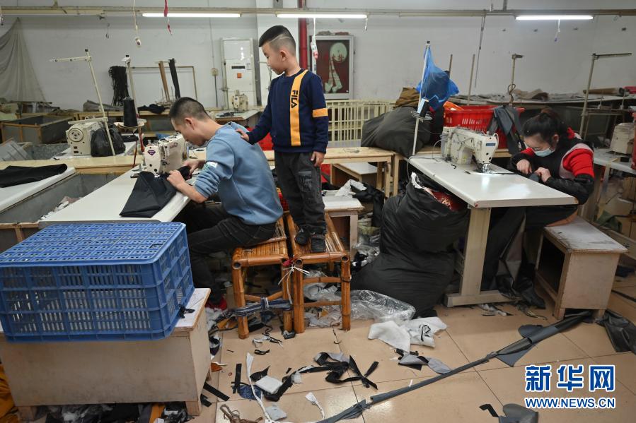 1月26日,在福建省石獅市的金利萊斯服裝廠,聰聰陪伴著為老家親人制作禮物的父母。